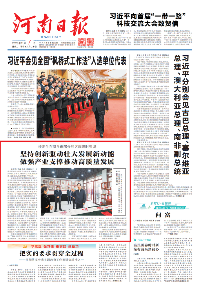 近日,省委书记楼阳生到商丘市梁园区、虞城县、民权县、宁陵县,调研产业发展、基层治理、文旅融合、生态环境保护等工作。(今日《河南日报》1版)
