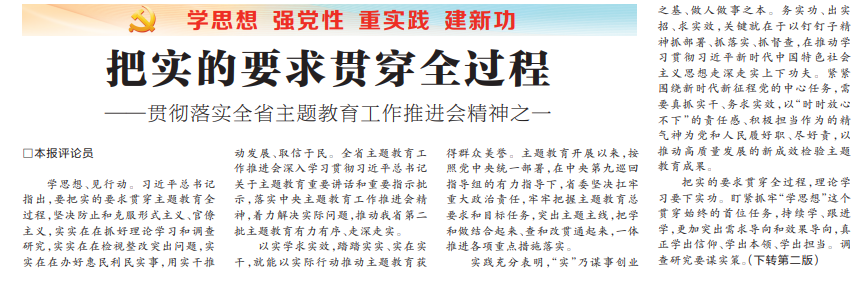 学思想、见行动。习近平总书记指出,要把实的要求贯穿主题教育全过程,坚决防止和克服形式主义、官僚主义,实实在在抓好理论学习和调查研究,实实在在检视整改突出问题,实实在在办好惠民利民实事,用实干推动发展、取信于民。全省主题教育工作推进会深入学习贯彻习近平总书记关于主题教育重要讲话和重要指示批示,落实中央主题教育工作推进会精神,着力解决实际问题,推动我省第二批主题教育有力有序、走深走实。(今日《河南日报》1版、2版)