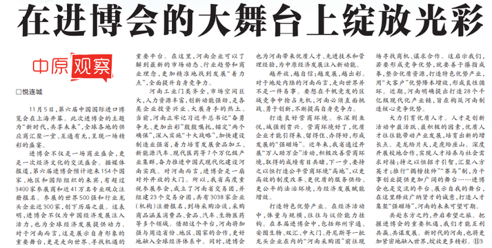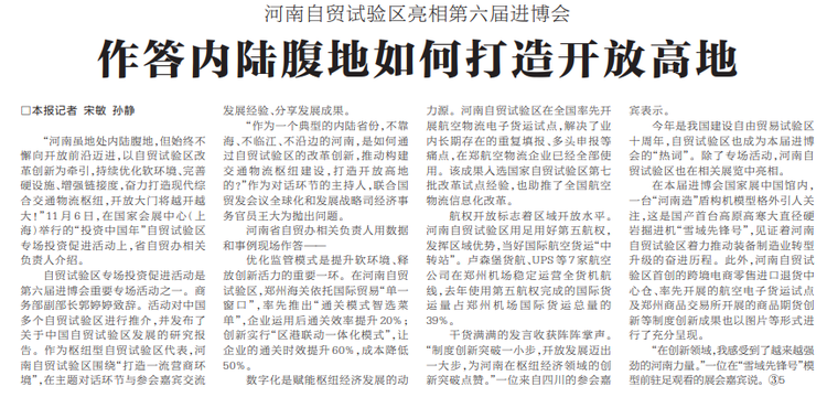 “河南虽地处内陆腹地,但始终不懈向开放前沿迈进,以自贸试验区改革创新为牵引,持续优化软环境、完善硬设施、增强链接度,奋力打造现代综合交通物流枢纽,开放大门将越开越大!”11月6日,在国家会展中心(上海)举行的“投资中国年”自贸试验区专场投资促进活动上,省自贸办相关负责人介绍。(今日《河南日报》2版)