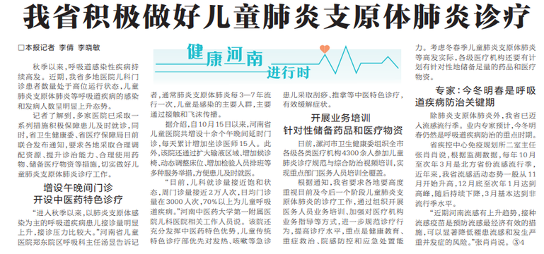 我省积极做好儿童肺炎支原体肺炎诊疗
