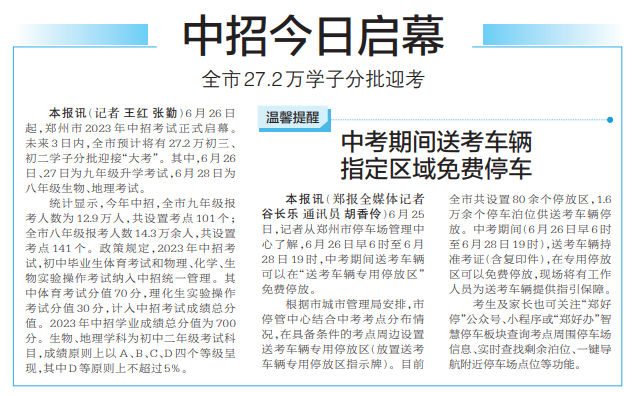 6月25日,记者从郑州市停车场管理中心了解,6月26日早6时至6月28日19时,中考期间送考车辆可以在“送考车辆专用停放区”免费停放。(今日《郑州日报》1版)