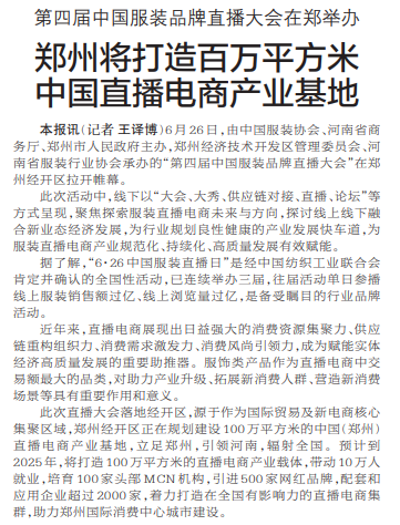 6月26日,由中国服装协会、河南省商务厅、郑州市人民政府主办,郑州经济技术开发区管理委员会、河南省服装行业协会承办的“第四届中国服装品牌直播大会”在郑州经开区拉开帷幕。(今日《郑州日报》1版)