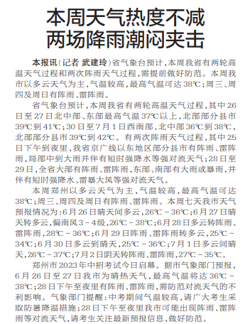 省气象台预计,本周我省有两轮高温天气过程和两次阵雨天气过程,需提前做好防范。本周我市以多云天气为主,气温较高,最高气温可达38℃;周三、周四及周日有阵雨、雷阵雨。(今日《郑州日报》1版)