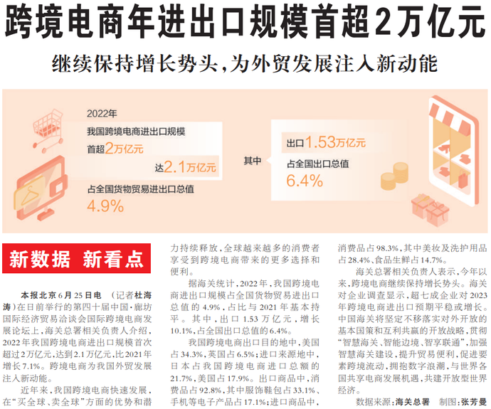 在日前举行的第四十届中国·廊坊国际经济贸易洽谈会国际跨境电商发展论坛上,海关总署相关负责人介绍,2022年我国跨境电商进出口规模首次超过2万亿元,达到2.1万亿元,比2021年增长7.1%。跨境电商为我国外贸发展注入新动能。(今日《人民日报》1版)
