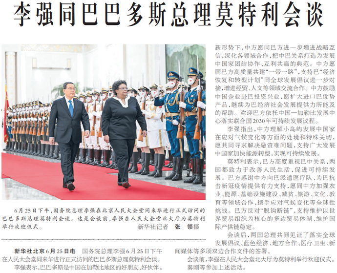 国务院总理李强6月25日下午在人民大会堂同来华进行正式访问的巴巴多斯总理莫特利会谈。(今日《人民日报》1版)