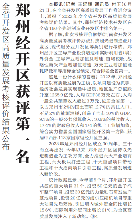 6月21日,在全省开发区高质量发展工作推进会议上,通报了2022年度全省开发区高质量发展考核评价结果。其中,郑州经济技术开发区在全省166个先进制造业开发区中排名第一。(今日《河南日报》2版)