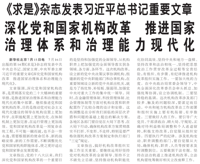7月16日出版的第14期《求是》杂志将发表中共中央总书记、国家主席、中央军委主席习近平的重要文章《深化党和国家机构改革 推进国家治理体系和治理能力现代化》。