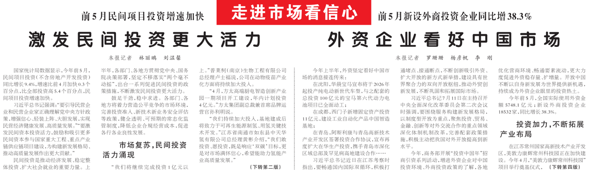 国家统计局数据显示,今年前5月,民间项目投资(不含房地产开发投资)同比增长9.4%,增速比前4月加快0.3个百分点,比全部投资高5.4个百分点,民间项目投资增速加快。(今日《人民日报》1版、2版)