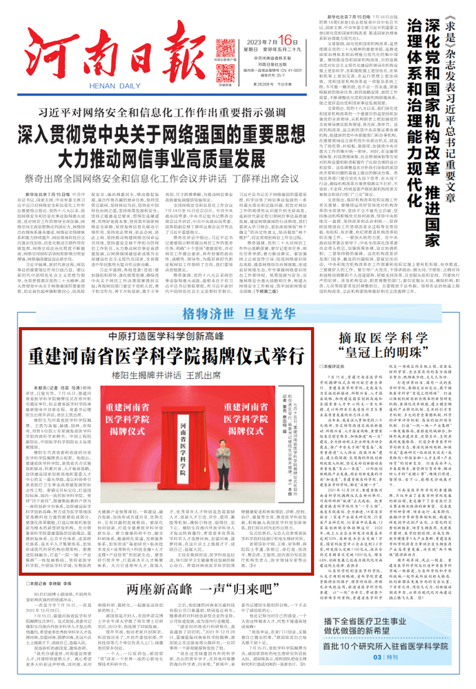 7月15日,重建河南省医学科学院揭牌仪式在郑州航空港区举行。重建省医学科学院,是我省大力实施创新驱动、科教兴省、人才强省战略,加快建设国家创新高地和全国重要人才中心的又一重大举措,是以科研牵引我省医疗卫生事业高质量发展的标志性工程。(今日《河南日报》1版)