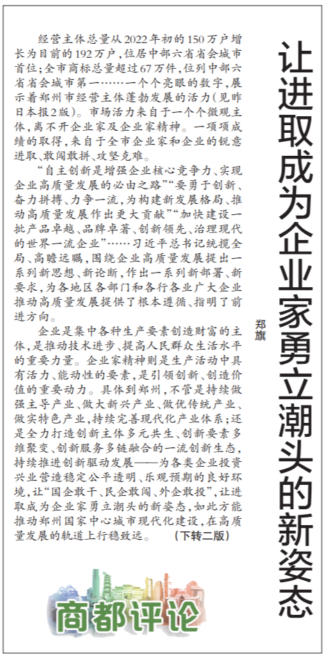 经营主体总量从2022年初的150万户增长为目前的192万户,位居中部六省省会城市首位;全市商标总量超过67万件,位列中部六省省会城市第一……一个个亮眼的数字,展示着郑州市经营主体蓬勃发展的活力(见昨日本报2版)。市场活力来自于一个个微观主体,离不开企业家及企业家精神。一项项成绩的取得,来自于全市企业家和企业的锐意进取、敢闯敢拼、攻坚克难。(今日《郑州日报》1版、2版)