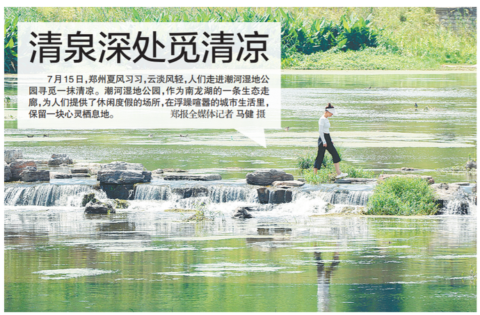 7月15日,郑州夏风习习,云淡风轻,人们走进潮河湿地公园寻觅一抹清凉。潮河湿地公园,作为南龙湖的一条生态走廊,为人们提供了休闲度假的场所,在浮躁喧嚣的城市生活里,保留一块心灵栖息地。(今日《郑州日报》1版)