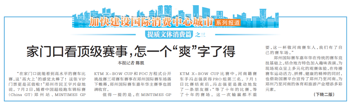 值得一提的是,在MINTIMES GP KTM X-BOW CUP比赛中,河南籍赛车手冯志强获得PRO组第三名。7月1日比赛结束后,冯志强更是激动地发了一条朋友圈:“等了十年的比赛,等了十年的赛场。这一次输赢都不重要,这一杯敬河南赛车人,我们有了自己的赛车场。”(今日《郑州日报》1版、2版)