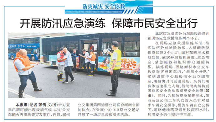 针对夏季汛期可能出现极端气候,应对公交车辆火灾事故等突发事件,近日,郑州公交集团第四运营公司联合河南省消防协会,在会展中心919路公交场站开展了一场应急救援演练活动。(今日《郑州日报》2版)