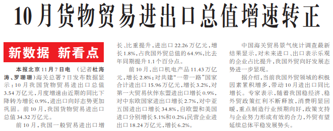 10月货物贸易进出口总值增速转正