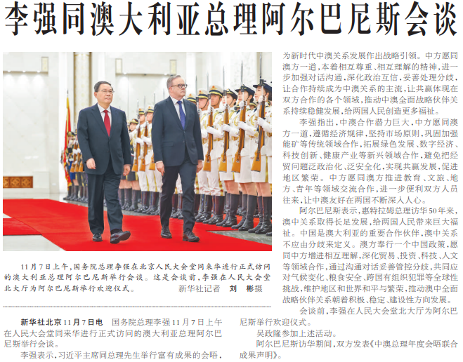 国务院总理李强11月7日上午在人民大会堂同来华进行正式访问的澳大利亚总理阿尔巴尼斯举行会谈。(今日《人民日报》1版)