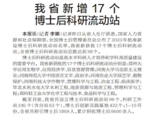记者昨日从省人社厅获悉,国家人力资源和社会保障部、全国博士后管理委员会公布了2023年批准新设博士后科研流动站名单,我省新获批17个博士后科研流动站,全省博士后科研流动站总数达到98个。(今日《郑州日报》1版)