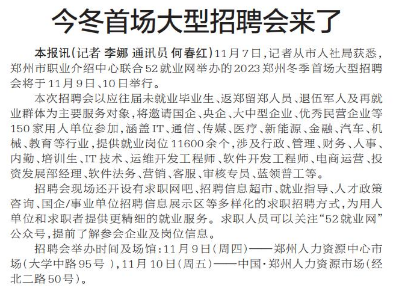 11月7日,记者从市人社局获悉,郑州市职业介绍中心联合52就业网举办的2023郑州冬季首场大型招聘会将于11月9日、10日举行。(今日《郑州日报》3版)