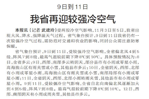 受两股冷空气影响,11月3日至5日,我省出现大风、降水、强降温天气过程。省气象台预计,9日到11日我省仍有一次较强冷空气过程,需防范对交通和农业的影响,同时公众需注意防寒保暖。(今日《郑州日报》3版)