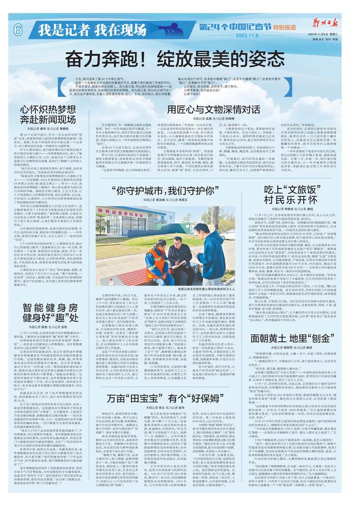 未觉三秋尽,时序已立冬。在这样阳光明媚的日子,那些仍在忙碌的新闻同仁们,迎来了属于自己的第24个中国记者节。这是特殊的一天,也是普通的一天,绝大多数的他们与平常并无两样,或是行色匆匆在采访途中,或是推心置腹在真诚对话,或是奋笔疾书在书桌之前,注定又要在忙碌中度过这个平凡而又特殊的日子。(今日《郑州日报》1版、3版)