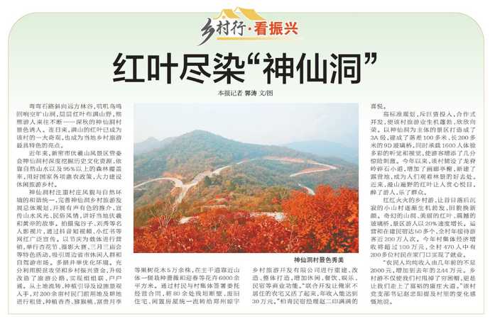 弯弯石路斜向远方林谷,叽叽鸟鸣回响空旷山涧,层层红叶布满山野,熙熙游人来往不断……深秋的神仙洞村景色诱人。连日来,满山的红叶已成为该村的一大奇观,也成为当地乡村旅游最具特色的亮点。(今日《郑州日报》8版)