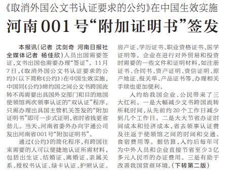 人员出国需要签证,文书出国也需要办理“签证”。11月7日,《取消外国公文书认证要求的公约》在中国生效实施,中国同《公约》缔约国之间公文书跨国流转不再需要出具国外交部门和目的地国使领馆两次领事认证的“双认证”程序,只需办理出具国主管机关签发的“附加证明书”即可一步式证明,省时省钱更省劲儿。当天,河南省委外办向宇通公司发出河南省001号“附加证明书”。(今日《河南日报》1版、2版)