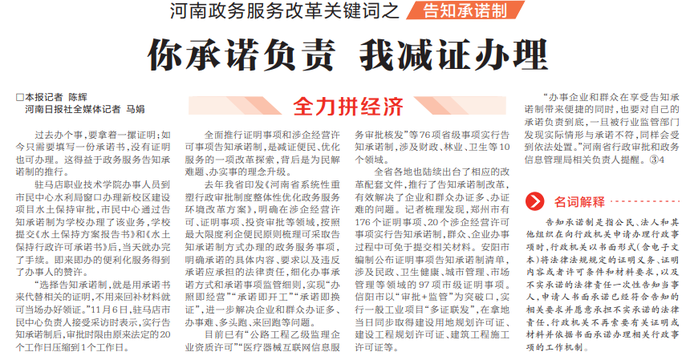 过去办个事,要拿着一摞证明;如今只需要填写一份承诺书,没有证明也可办理。这得益于政务服务告知承诺制的推行。(今日《河南日报》1版)