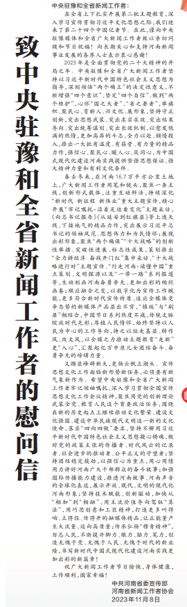 在全省上下扎实开展第二批主题教育,深入学习宣传贯彻习近平文化思想之际,我们迎来了第二十四个中国记者节。在此,谨向中央驻豫媒体和全省广大新闻工作者致以亲切问候和节日祝福!向长期关心和支持河南新闻事业发展的各界人士表示衷心感谢!(今日《河南日报》4版)