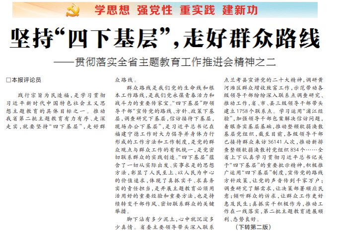 践行宗旨为民造福,是学习贯彻习近平新时代中国特色社会主义思想主题教育的具体目标之一。推动我省第二批主题教育有力有序、走深走实,就要坚持“四下基层”,走好群众路线。