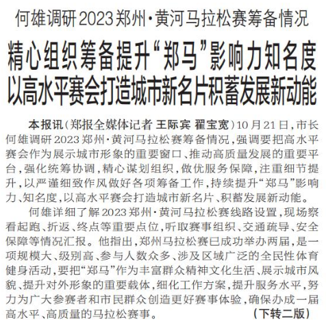 10月21日,市长何雄调研2023郑州·黄河马拉松赛筹备情况,强调要把高水平赛会作为展示城市形象的重要窗口、推动高质量发展的重要平台,强化统筹协调,精心谋划组织,做优服务保障,注重细节提升,以严谨细致作风做好各项筹备工作,持续提升“郑马”影响力、知名度,以高水平赛会打造城市新名片、积蓄发展新动能。(今日《郑州日报》1版、2版)