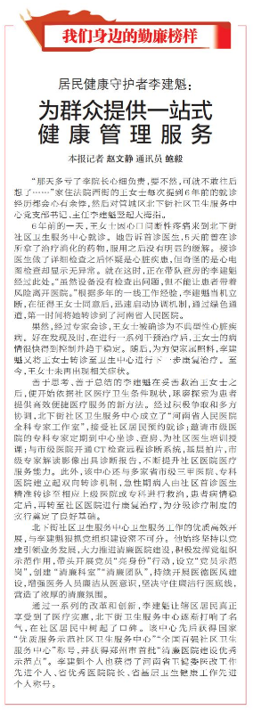 “那天多亏了李院长心细负责,要不然,可就不敢往后想了……”家住法院西街的王女士每次提到6年前的就诊经历都会心有余悸,然后对管城区北下街社区卫生服务中心党支部书记、主任李建魁竖起大拇指。(今日《郑州日报》2版)