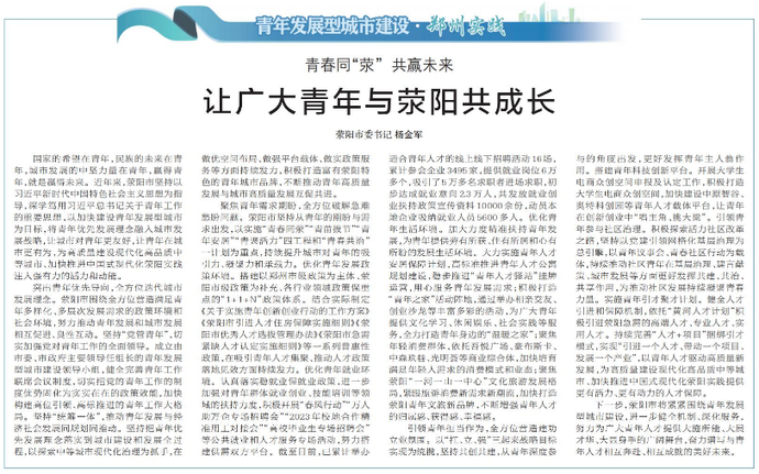 国家的希望在青年,民族的未来在青年,城市发展的中坚力量在青年,赢得青年,就是赢得未来。近年来,荥阳市坚持以习近平新时代中国特色社会主义思想为指导,深学笃用习近平总书记关于青年工作的重要思想,以加快建设青年发展型城市为目标,将青年优先发展理念融入城市发展战略,让城市对青年更友好,让青年在城市更有为,为高质量建设现代化高品质中等城市、加快推进中国式现代化荥阳实践注入强有力的活力和动能。(今日《郑州日报》2版)