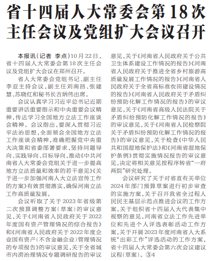 10月22日,省十四届人大常委会第18次主任会议及党组扩大会议在郑州召开。(今日《河南日报》1版)