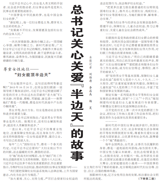 习近平总书记心中,妇女是人类文明的开创者、社会进步的推动者,妇女事业始终是党和人民事业的重要组成部分。(今日《人民日报》1版、2版)