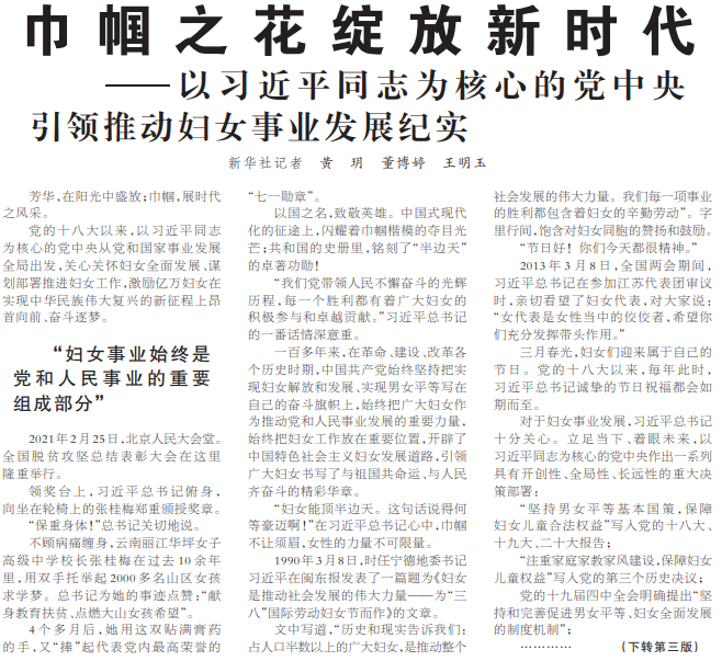 党的十八大以来,以习近平同志为核心的党中央从党和国家事业发展全局出发,关心关怀妇女全面发展、谋划部署推进妇女工作,激励亿万妇女在实现中华民族伟大复兴的新征程上昂首向前、奋斗逐梦。(今日《人民日报》1版、3版)