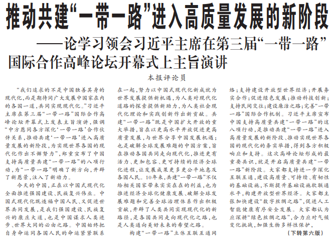 “我们追求的不是中国独善其身的现代化,而是期待同广大发展中国家在内的各国一道,共同实现现代化。”习近平主席在第三届“一带一路”国际合作高峰论坛开幕式上发表主旨演讲,强调“中方愿同各方深化‘一带一路’合作伙伴关系,推动共建‘一带一路’进入高质量发展的新阶段,为实现世界各国的现代化作出不懈努力”,郑重宣布了中国支持高质量共建“一带一路”的八项行动,为“一带一路”明确了新方向,开辟了新愿景,注入了新动力。(今日《人民日报》1版、6版)