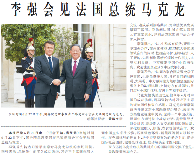 当地时间6月22日下午,国务院总理李强在巴黎爱丽舍宫会见法国总统马克龙。