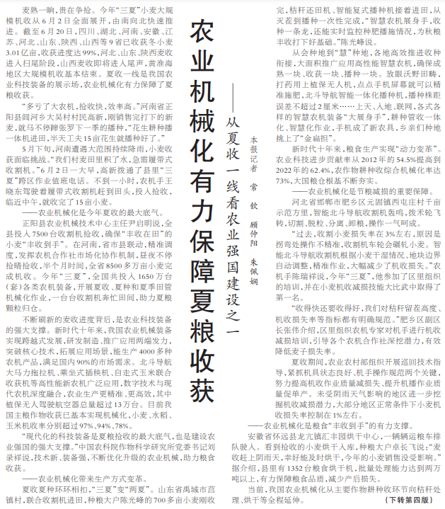 麦熟一晌,贵在争抢。今年“三夏”小麦大规模机收从6月2日全面展开,由南向北快速推进。截至6月20日,四川、湖北、河南、安徽、江苏、河北、山东、陕西、山西等9省已收获冬小麦3.01亿亩,收获进度达99%,河北、山东、陕西麦收进入扫尾阶段,山西麦收即将进入尾声,黄淮海地区大规模机收基本结束。夏收一线是我国农业科技装备的展示场,农业机械化有力保障了夏粮收获。(今日《人民日报》1版、4版)