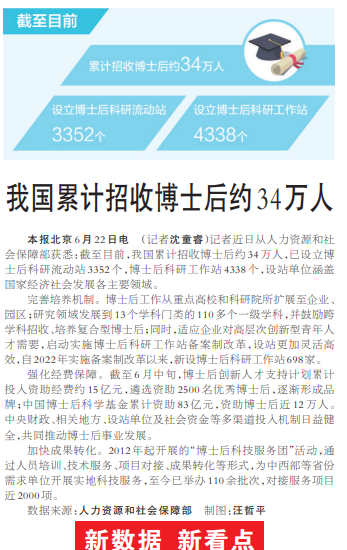 记者近日从人力资源和社会保障部获悉:截至目前,我国累计招收博士后约34万人,已设立博士后科研流动站3352个,博士后科研工作站4338个,设站单位涵盖国家经济社会发展各主要领域。(今日《人民日报》1版)