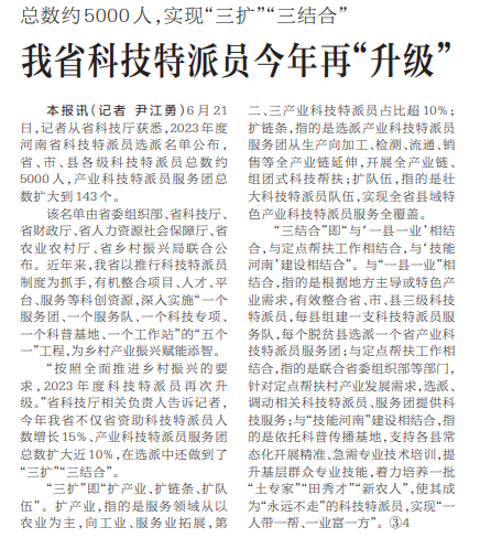 6月21日,记者从省科技厅获悉,2023年度河南省科技特派员选派名单公布,省、市、县各级科技特派员总数约5000人,产业科技特派员服务团总数扩大到143个。(今日《河南日报》1版)
