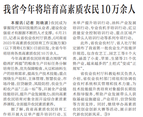农民成为掌握现代知识技能的从业者,建设农业强省才有源源不断的人才支撑。6月21日,记者从省农业农村厅获悉,《河南省2023年高素质农民培育工作实施方案》日前印发,全省今年将培育各类高素质农民10万余人。(今日《河南日报》2版)
