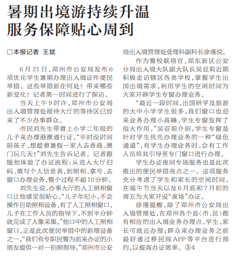 6月21日,郑州市公安局发布6项优化学生暑期办理出入境证件便民举措。这些举措新在何处?带来哪些新变化?记者第一时间进行了探访。(今日《河南日报》2版)