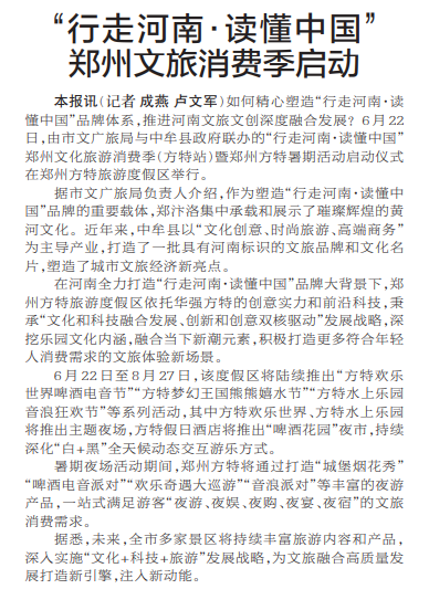 如何精心塑造“行走河南·读懂中国”品牌体系,推进河南文旅文创深度融合发展?6月22日,由市文广旅局与中牟县政府联办的“行走河南·读懂中国”郑州文化旅游消费季(方特站)暨郑州方特暑期活动启动仪式在郑州方特旅游度假区举行。(今日《郑州日报》2版)