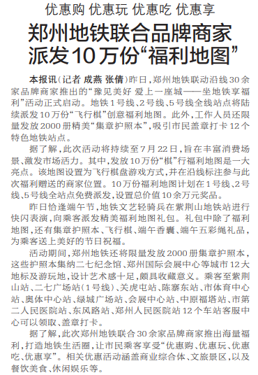 郑州地铁联合品牌商家派发10万份“福利地图”