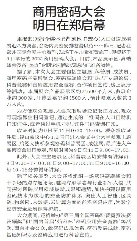 入口处道旗招展迎八方宾客,会场内周密安排蓄势以待……昨日,记者在郑州国际会展中心看到,现场正在加紧布置施工,迎接将于9日举行的2023商用密码大会。目前,产品展示区、高端峰会及各“热点”专题论坛活动现场均已准备就绪。(今日《郑州日报》1版)