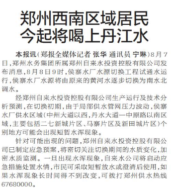 8月7日,郑州水务集团所属郑州自来水投资控股有限公司发布消息,8月8日9时,侯寨水厂水源切换工程试通水运行,侯寨水厂水源将由原来的黄河水逐步切换为南水北调水。(今日《郑州日报》1版)