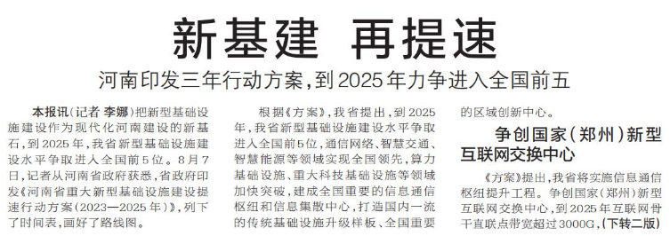 把新型基础设施建设作为现代化河南建设的新基石,到2025年,我省新型基础设施建设水平争取进入全国前5位。8月7日,记者从河南省政府获悉,省政府印发《河南省重大新型基础设施建设提速行动方案(2023—2025年)》,列下了时间表,画好了路线图。(今日《郑州日报》1版、2版)