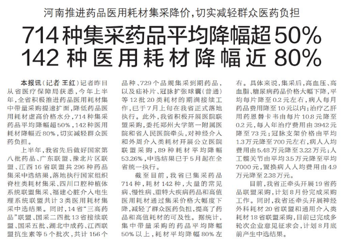 记者昨日从省医疗保障局获悉,今年上半年,全省积极推进药品医用耗材集中带量采购提速扩面,降低药品医用耗材虚高价格水分,714种集采药品平均降幅超50%,142种医用耗材降幅近80%,切实减轻群众医药负担。(今日《郑州日报》2版)