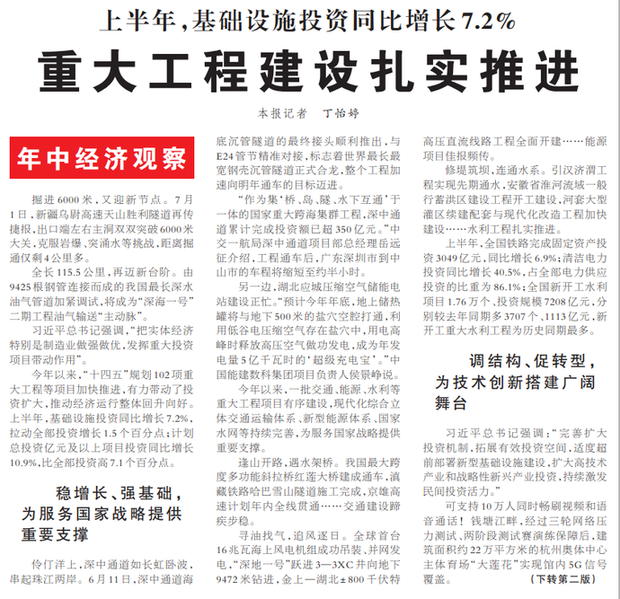 掘进6000米,又迎新节点。7月1日,新疆乌尉高速天山胜利隧道再传捷报,出口端左右主洞双双突破6000米大关,克服岩爆、突涌水等挑战,距离掘通仅剩4公里多。(今日《人民日报》1版、2版)