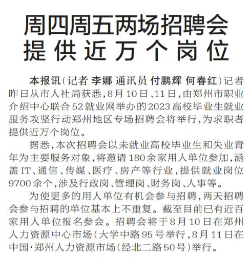 记者昨日从市人社局获悉,8月10日、11日,由郑州市职业介绍中心联合52就业网举办的2023高校毕业生就业服务攻坚行动郑州地区专场招聘会将举行,为求职者提供近万个岗位。(今日《郑州日报》2版)