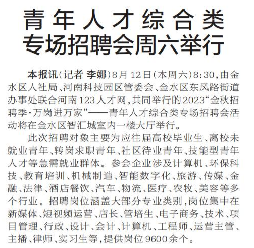8月12日(本周六)8:30,由金水区人社局、河南科技园区管委会、金水区东风路街道办事处联合河南123人才网,共同举行的2023“金秋招聘季·万岗进万家”——青年人才综合类专场招聘会活动将在金水区智汇城室内一楼大厅举行。(今日《郑州日报》2版)